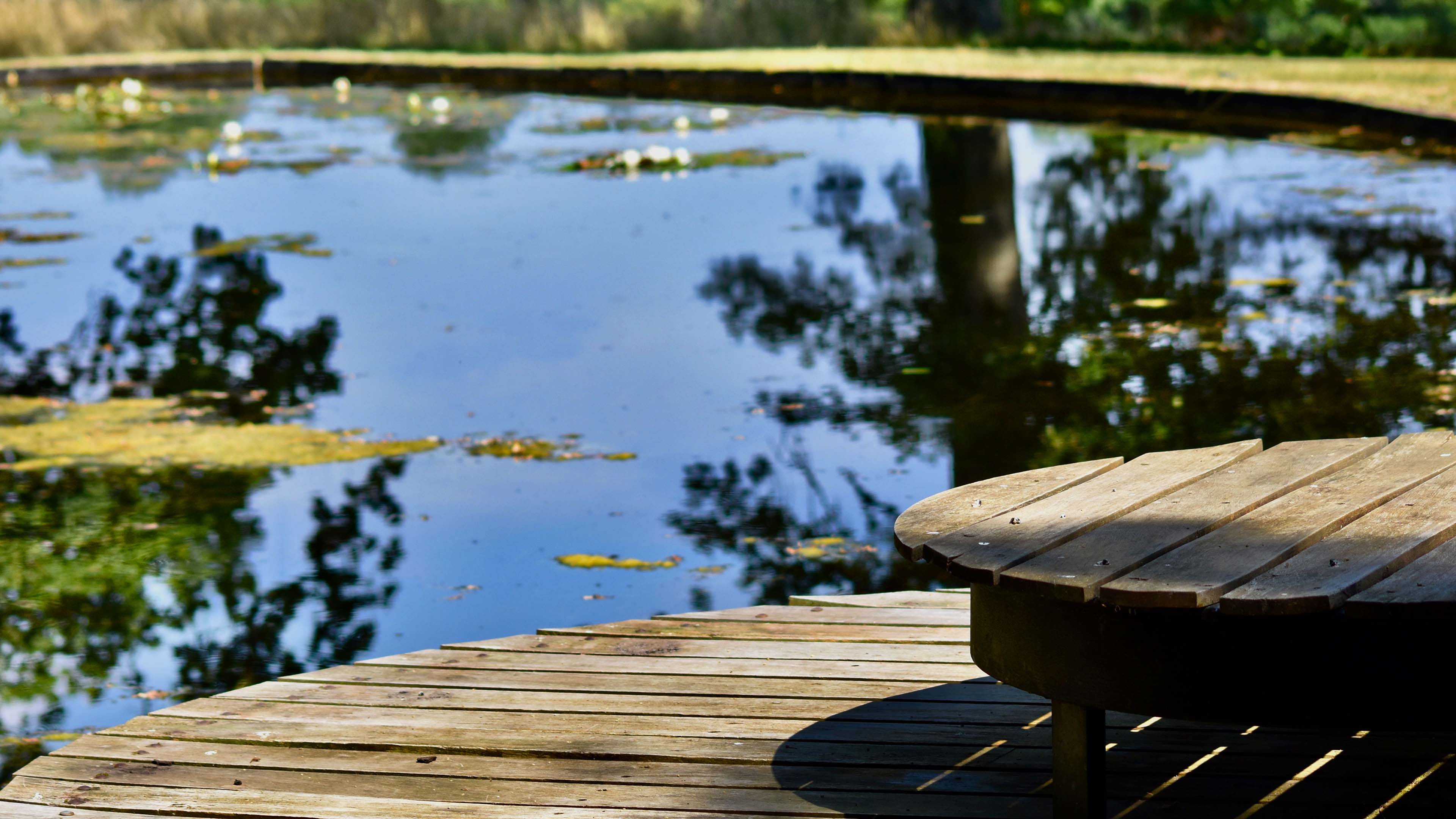 Come back to the South side of the Temple and gaze for a while at the reflections in the Zen Pond, created by Joanna Mersey where a water garden used to be one hundred years ago. Now you may wish to take the Woodland Path. This winds its way on to a little summerhouse made from a large cedar that was blown down by a storm that tossed the old summerhouse over the trees, to land in pieces below the ha-ha. In front of the present summerhouse is an area of long grass with many wild flowers including, in June, several varieties of purple orchids.
