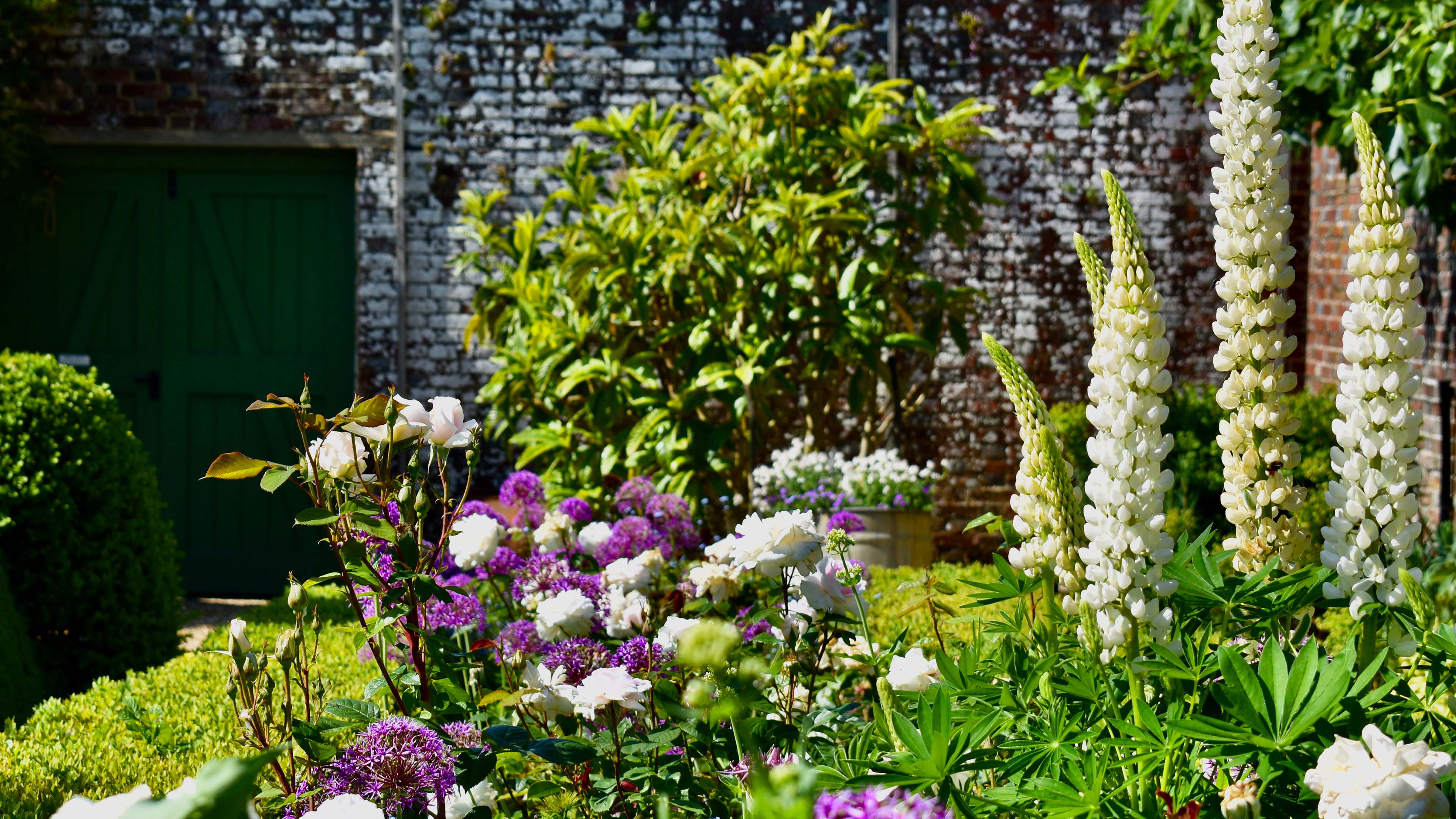 As you enter the garden through the double green doors, you will find on your immediate left a mature loquat tree (Eriobotrya japonica). Originally from China, it is unusual in that it flowers in autumn. On your right is the Orchard with apple and pear trees. After the orchard, the path leads you in to the Walled Garden. The borders consist of brightly coloured herbaceous perennials and behind the low wall is a line of pleached limes, pruned so that the South Downs are still visible in the distance.